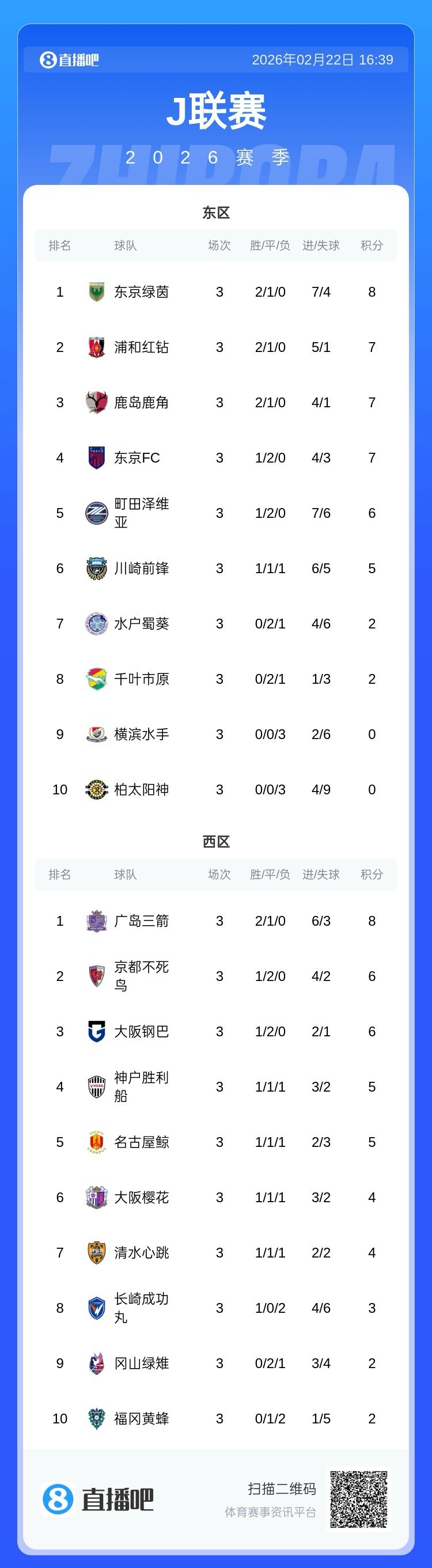 2月22日讯 2026年J1百年构想联赛(26/27赛季跨年赛季前的特别赛季)第2轮全部比赛于今天下午落下帷幕,本轮过后已经没有全胜球队(注:点球大战取胜的按平局算)。东区方面,东京绿茵点球击败町田泽维亚,开局前三场2胜1平领跑东区积分榜;浦和红钻、鹿岛鹿角取胜后分列积分榜二三位。劲旅横滨...